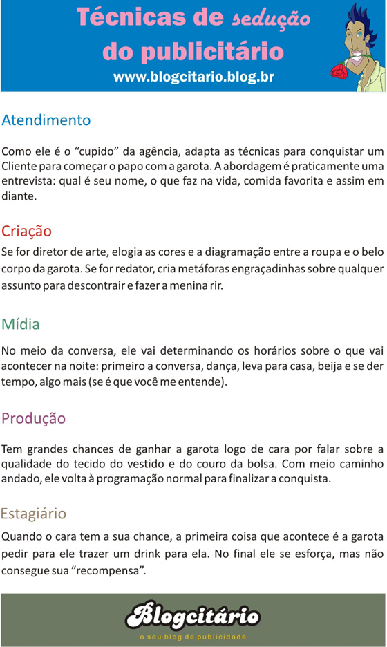 Neste post, você vai saber como se comporta cada tipo de publicitário quando quer seduzir uma garota. Lembrando que este “guia” não deve ser levado a sério e qualquer semelhança com a realidade é mera coincidência.