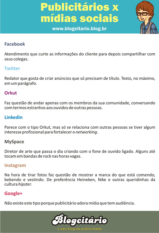Para descontrair, comparei comportamentos típicos de quem trabalha no mercado publicitário com o Facebook, Twitter, Orkut, Linkedin, MySpace, Instagram e Google+.