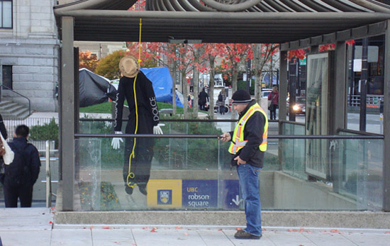 Eles produziram 27 “bonecos-suicidas” e colocaram em vários pontos de Vancouver com placas e textos indicando o site. Eles tiveram o cuidado para que qualquer um identificasse logo de cara que se trata de um boneco para não causar pânico generalizado entre as pessoas. Mesmo assim, muita gente parou para observar a ação.