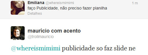 Sou dona de uma das arrobinhas ali, e sim moço, eu conheço o serviço de Mídia, muito bem até. O comentário se referia à um episódio em sala de aula, e a resposta “super legal” do meu amigo economista diz respeito à eles acharem que nosso curso se resume a slides e divulgar as festas da universidade (isso é sério).