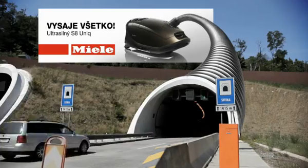 Os criativos da McCann Erickson da Eslováquia devem ter incorporado o espírito troll dos internautas ao colocarem a ideia de anunciar o aspirador de pó Miele. Sem investir nenhuma verba, os caras jogaram na internet um vídeo de um dos túneis mais famosos do país. No estilo “invejosos dirão que é Photoshop”, eles editaram e colocaram no topo do túnel um outdoor digital do produto para mostrar que o aparelho suga tudo, até carros e caminhões.